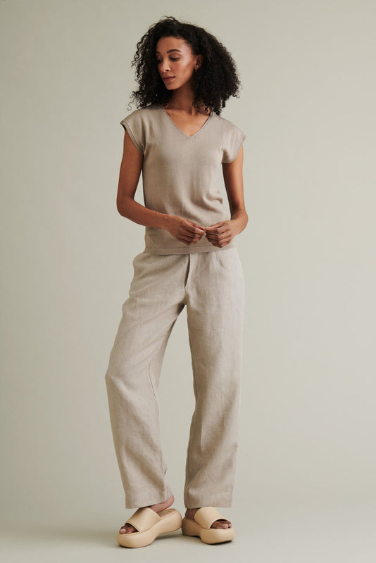 Heisala-broeken zijn nette en ontspannen rechte broeken die geschikt zijn voor zowel casual als meer formele kleding. Hennep als materiaal voelt prettig en ademend aan. Hennep is iets dikker en duurzamer dan linnen. De broeken hebben volledige lange pijpen en een hoge taille. Er is een ritssluiting en een knoopsluiting aan de voorkant van de taille, met een elastische tailleband aan de achterkant.
