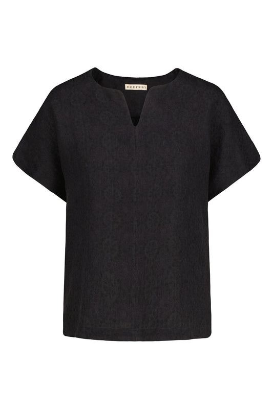 De Lappo top combineert ontspannen comfort met een vrouwelijke touch. Een split bij de halslijn en korte mouwen voegen lichtheid toe, terwijl afgeronde splits bij de halslijn, mouwuiteinden en zoom een uitgebalanceerd en verfijnd ontwerp creëren.