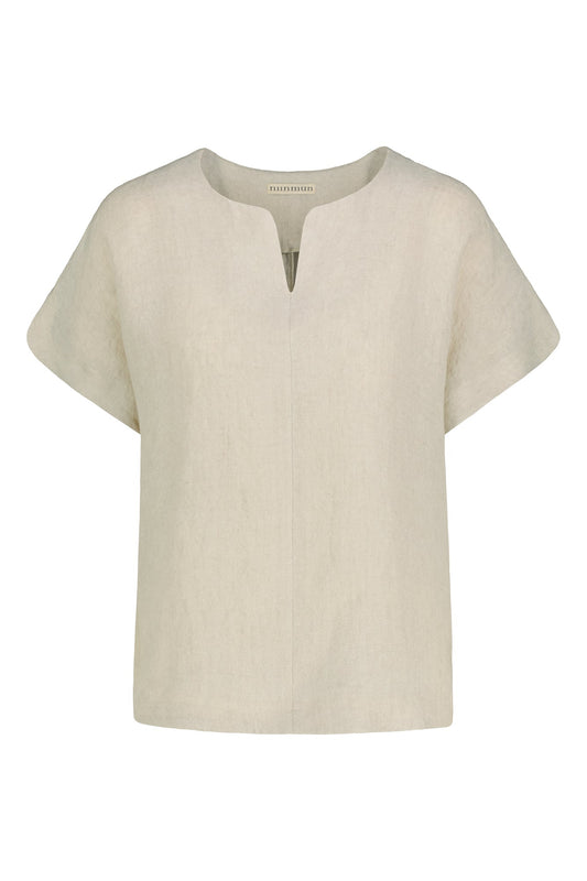 De Lappo-top combineert ontspannen comfort met een vrouwelijke touch. Een split bij de halslijn en korte mouwen voegen luchtigheid toe, terwijl afgeronde splitten bij de halslijn, mouwuiteinden en zoom een uitgebalanceerd en verfijnd ontwerp creëren.