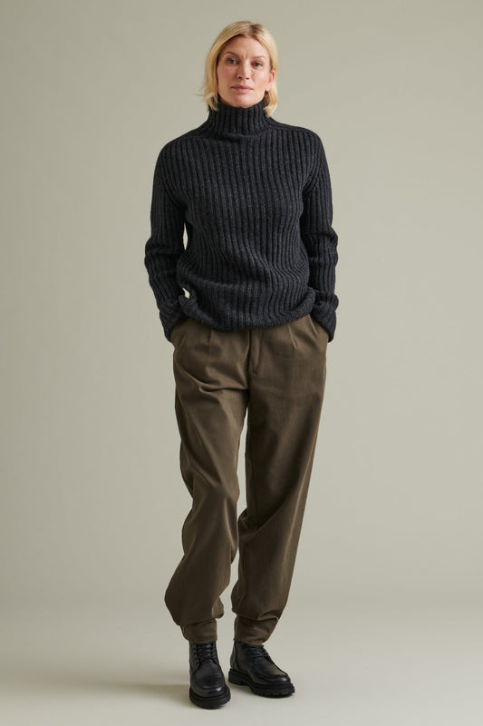 De Utö-wollen trui is een moderne versie van traditionele archipel-breigoed. Het verrukkelijke detail van de trui is de schouderlijn, die van de mouw direct doorloopt naar de opstaande kraag. De opstaande kraag is 8 cm hoog. De pasvorm is recht en de lengte is ideaal, zodat verbreding bij de heupen wordt vermeden. Er zijn geen aparte geribde boorden of zoom. De mouw is opzettelijk lang; door de mouw op te rollen, je voeg je structuur toe aan de trui terwijl de lange mouw warmte biedt.