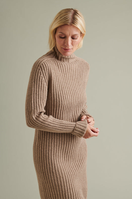 De Utö gebreide jurk is een klassieke, lange en stijlvolle wollen jurk gemaakt van zachte 100% merinowol. Het heeft een tijdloos en eenvoudig recht ontwerp. Een mooi detail is de schouderlijn, die naadloos doorloopt van de mouw naar de halslijnkraag. Er is een opstaande kraag die naar binnen gevouwen kan worden om een mooi accent aan de halslijn toe te voegen. De lange mouw biedt heerlijke warmte en kan worden opgerold voor extra structuur.