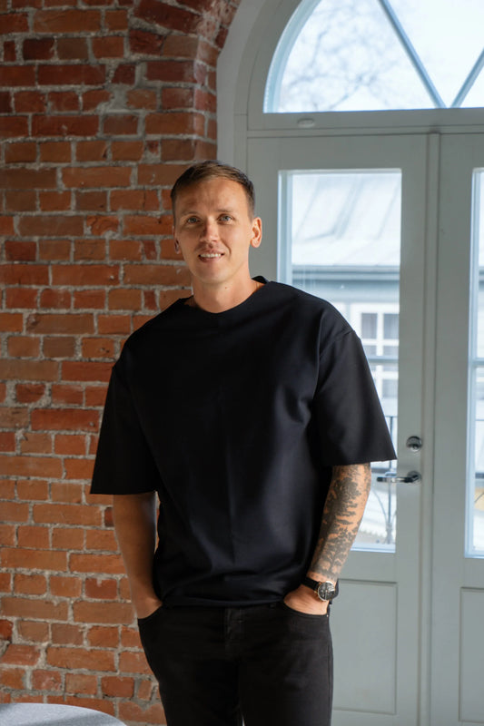Een opzettelijk oversized silhouet met naadloze constructie door de mouwen, zoom en kraag levert een gepolijste esthetiek zonder zichtbare stiksels. De niet-uitrafelende stof biedt je de vrijheid om de lengte precies aan te passen aan jouw voorkeur, wat zowel comfort als maatwerk in een enkel stuk biedt.