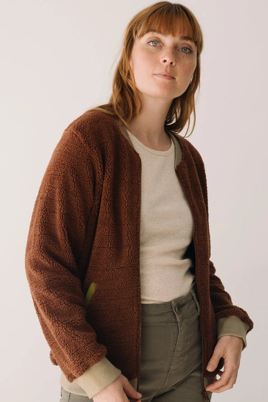 Dit Sherpa Jacket is een bomberjack gemaakt voor koud weer - warm, comfortabel en veelzijdig. Een rits aan de voorkant, steekzakken van ribfluweel en contrasterende geribde boorden combineren functie met stijl. Gemaakt van dik 100% GOTS-gecertificeerd organisch katoenen Sherpa met een zachte, donzige textuur en volledig gevoerd met organisch katoenen jersey voor extra isolatie en flexibiliteit. De bruine kleur is tijdloos en neutraal en is geschikt voor alle seizoenen en outfits.