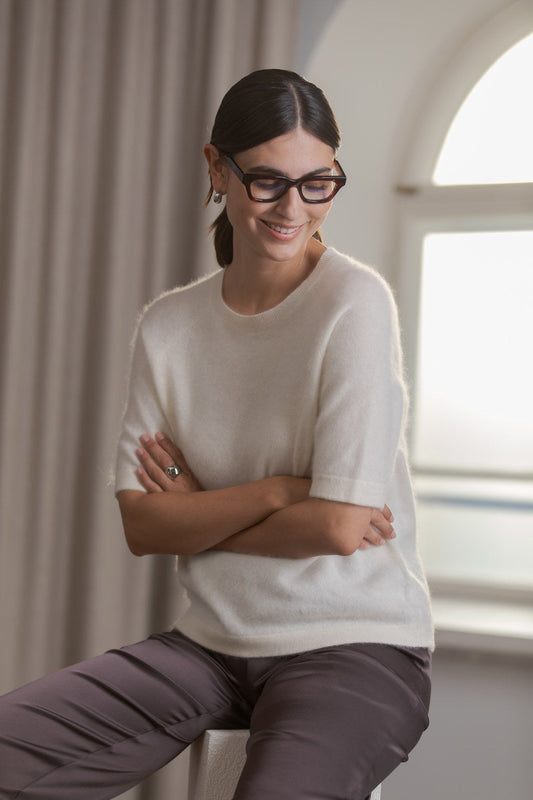 Ervaar luxueus comfort en tijdloze stijl met de Karlie Korte Mouw Cashmere Trui. Gemaakt van 100% puur cashmere, biedt deze trui ongeëvenaarde zachtheid en warmte. De korte mouwen geven een moderne twist aan deze klassieke garderobe-essentieel. Verhoog jouw uitstraling met Karlie's kenmerkende gratie en verfijning.