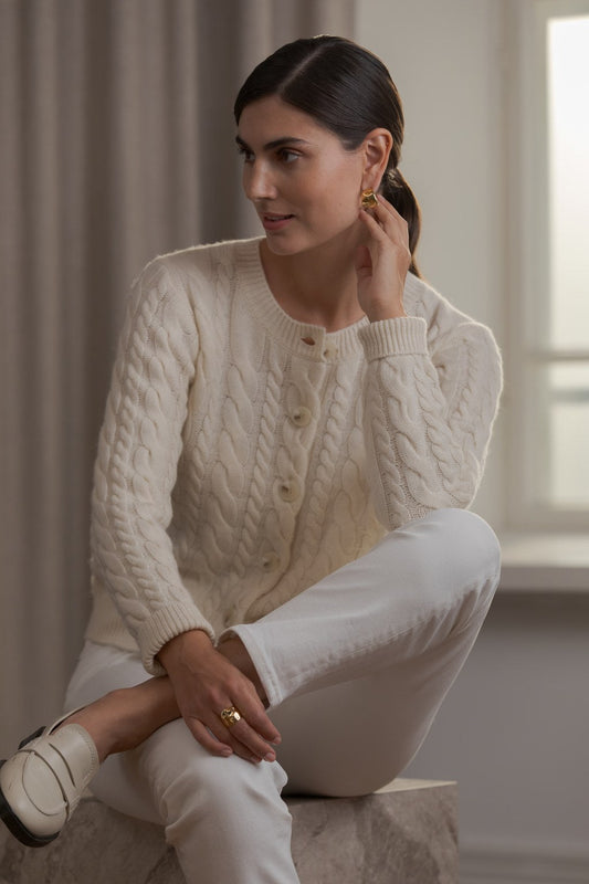 Vivianna Cable Knit Wool Cashmere Blend Cardigan Cream