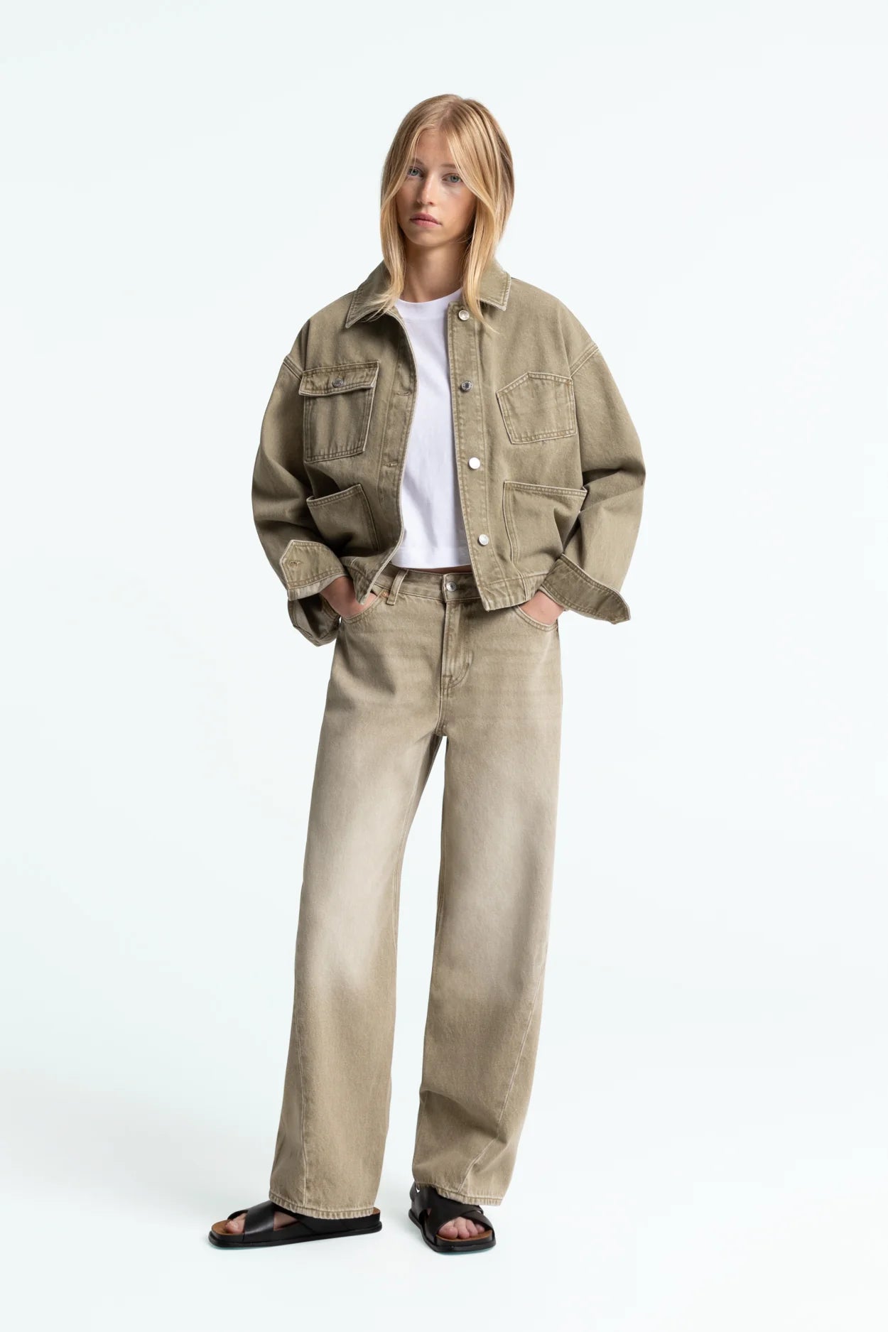 Kort jasje met een normale pasvorm - geïnspireerd door werkkleding, met een verborgen knoopsluiting en knopen bij de mouwopening. De twee voorzakken strekken zich uit over de onderste zoom, wat een functionele en stijlvolle touch toevoegt.