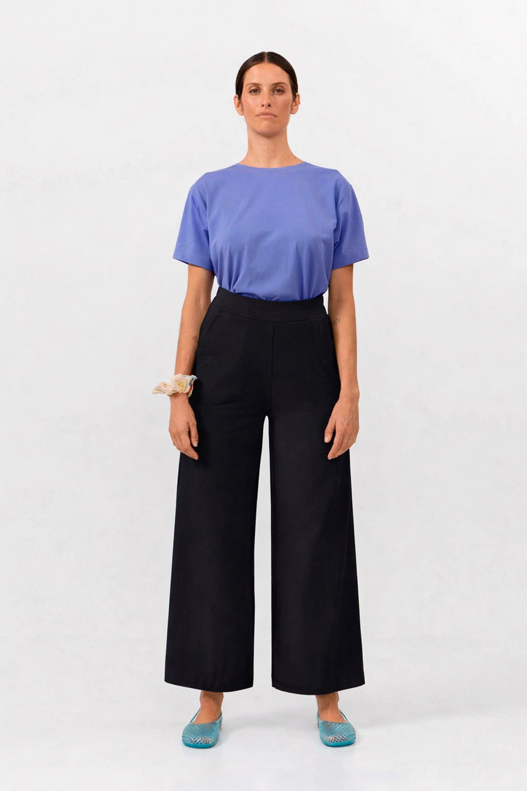 Jerseybroek met wijde pijpen, zakken aan de voorkant en elastische band op de tailleband voor een betere pasvorm. De focus ligt op gemak, comfort en draagbaarheid. Eén van die stukken die stilletjes zijn werk goed doet.