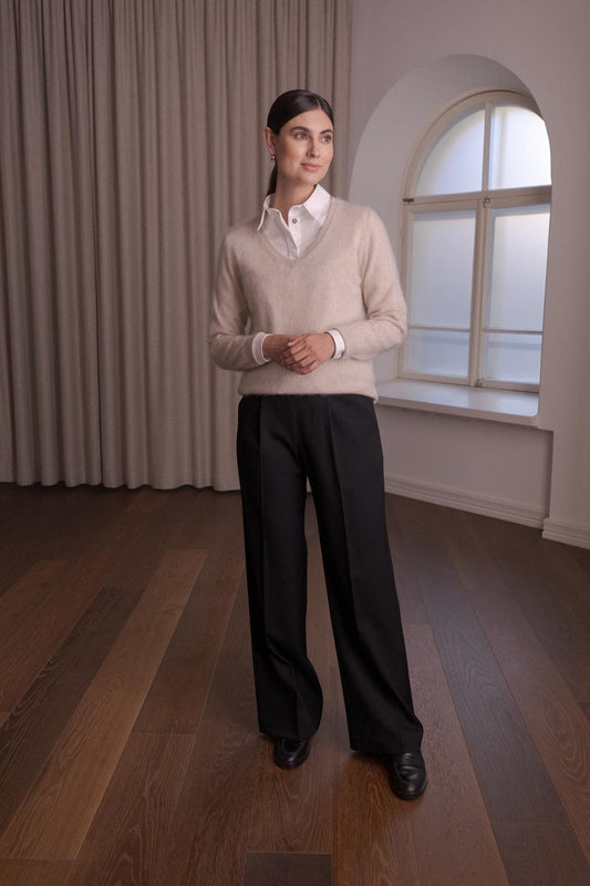 Deze klassieke V-hals trui in een zachte latte tint is gemaakt van 100% kasjmier voor uitzonderlijk comfort en luxe. De aangesloten mouwen bieden een verfijnd silhouet, terwijl de bredere elastische manchetten en zoom structuur en duurzaamheid bieden. Ontworpen in een reguliere pasvorm, kan het moeiteloos over overhemden met een kraag worden gedragen, waardoor het een elegante en veelzijdige toevoeging is aan jouw garderobe.