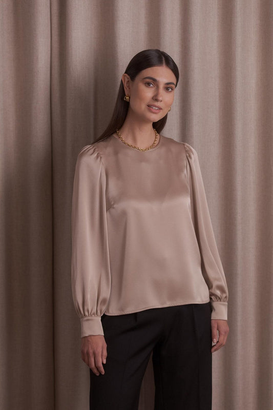 Tenesha Long-Sleeve Puff Sleeve Satin Shirt Latte