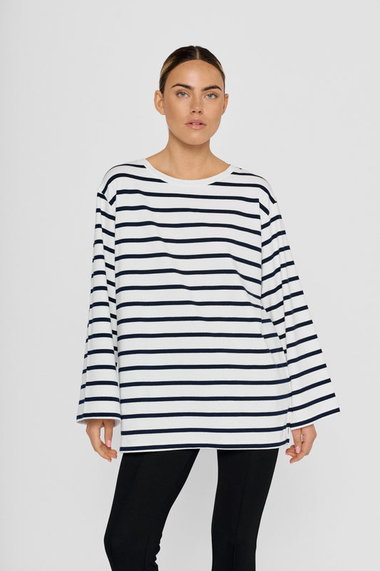 Lange mouwen T-shirt met klassieke zwart-witte Bretonse strepen. De top met ontspannen pasvorm heeft een langer lijf met korte zijsplitten voor een verlengde silhouet en gemakkelijke beweging. Gemaakt van lichtgewicht stretch jersey organisch katoenmix.