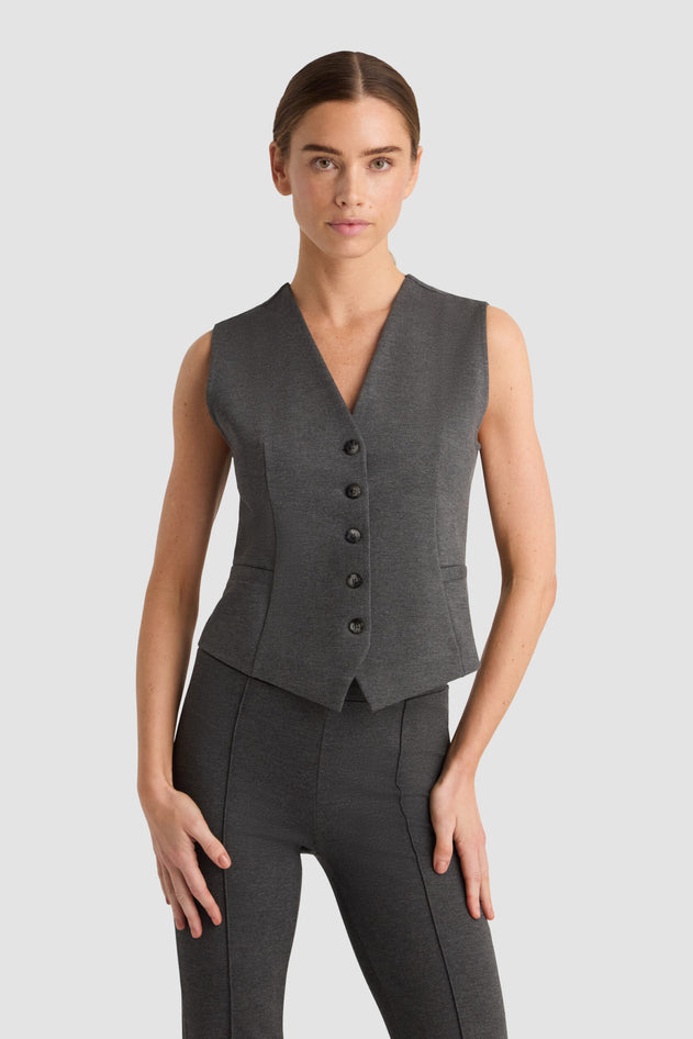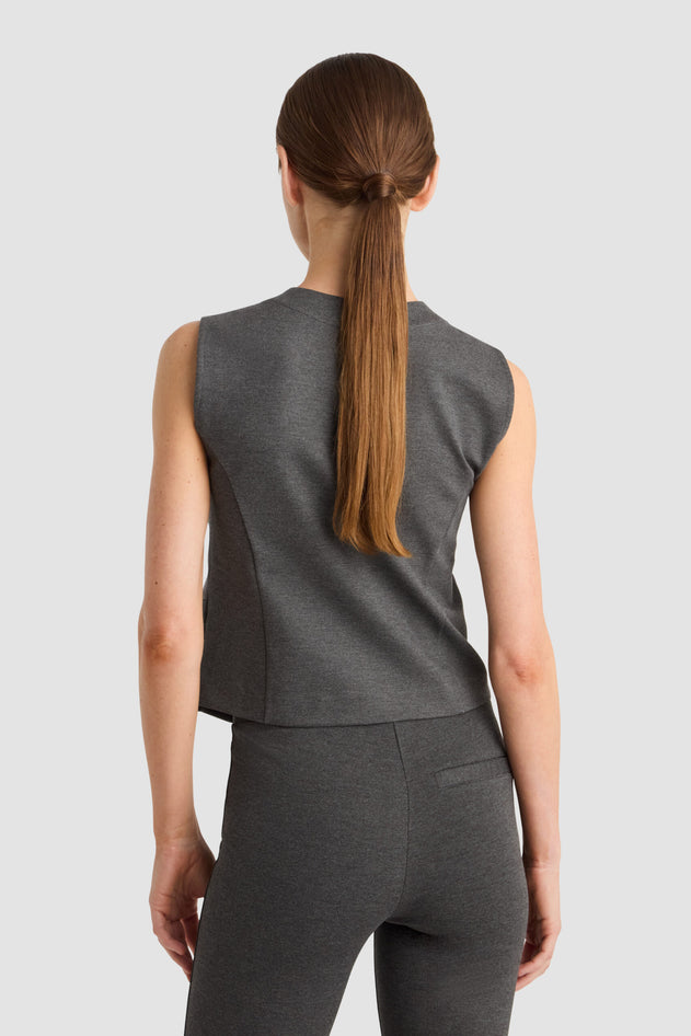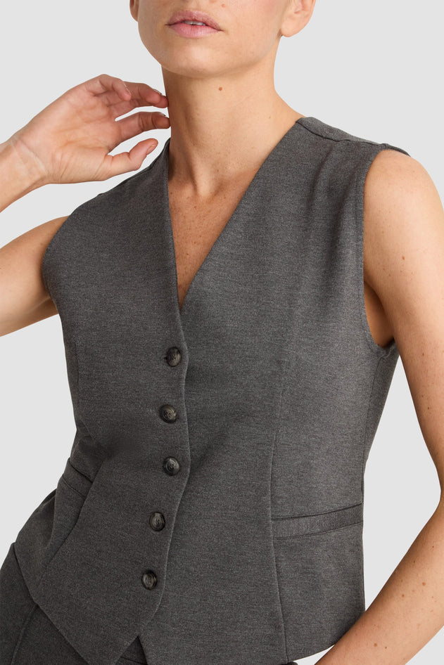Het Courtney Vest in Graphite Melange biedt een verfijnd silhouet met zijn rechte pasvorm en licht verkorte lengte. Vakkundig op maat gemaakt, heeft het twee voorste paspelzakken die het strakke ontwerp versterken. Dit vest levert een vrouwelijke en verfijnde uitstraling, waardoor het een veelzijdige aanvulling is op elke garderobe die op zoek is naar ingetogen elegantie.
