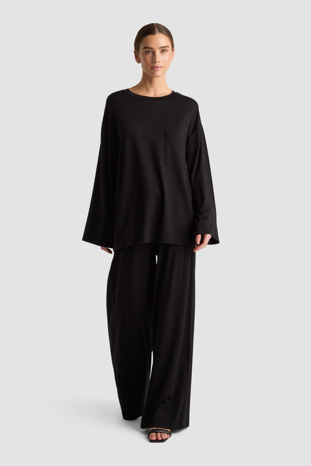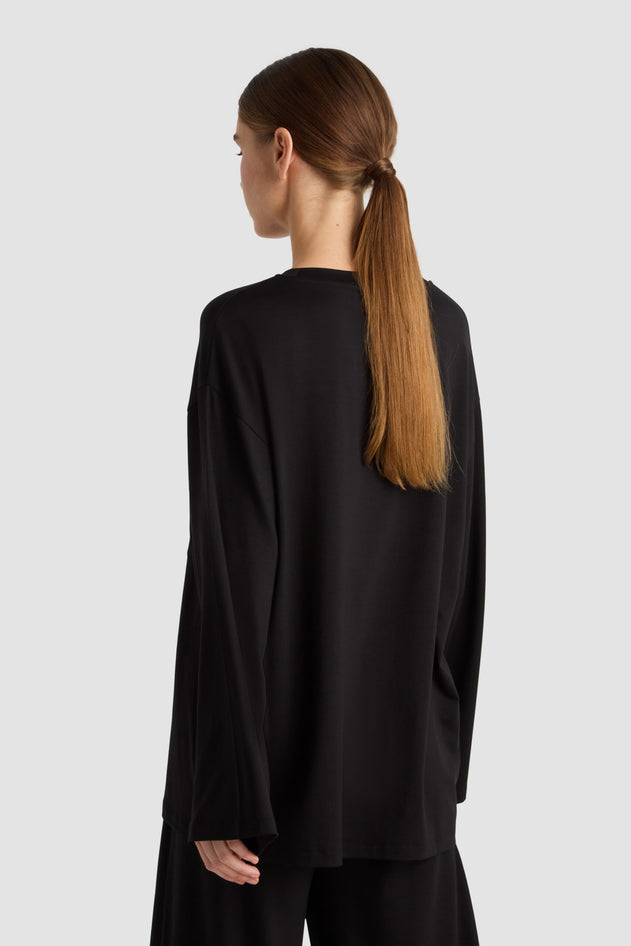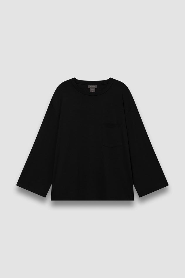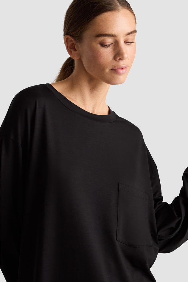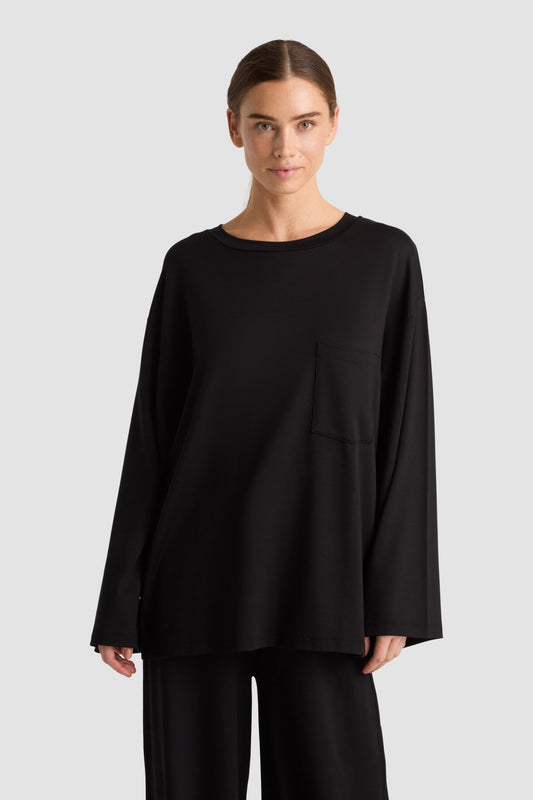De Goma Top in zwart biedt een ontspannen, rechte silhouet ontworpen voor comfort en gemak. Met een ronde halslijn en lange mouwen biedt het een veelzijdige laagoptie. De borstzak voegt subtiele details toe, waarbij praktisch nut wordt gecombineerd met een minimalistische stijl, waardoor het een essentieel stuk is voor een verfijnde, casual garderobe.