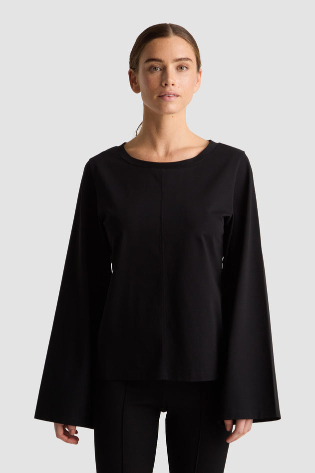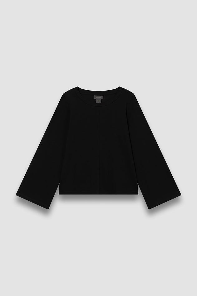 The Thelma Top in zwart biedt een verfijnde maar ontspannen pasvorm, met een subtiel gedefinieerde taille die het silhouet verbetert zonder in te boeten op comfort. Vakkundig op maat gemaakt met elegante details, heeft het een ronde halslijn en lange, wijde mouwen die een verfijnde touch toevoegen aan dit veelzijdige stuk. Ideaal voor degenen die op zoek zijn naar een ingetogen stijl met een gepolijste afwerking.