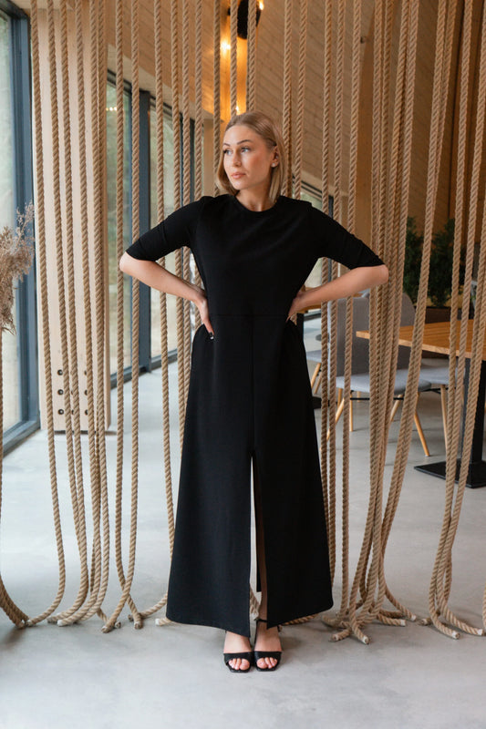 The Rica dress is a simple straight cut, well-fitting dress with pockets, with slits in the front and back that create the visual of pants and not a dress when walking. The dress is made of a nice, stretchy crepe fabric and does not require ironing.