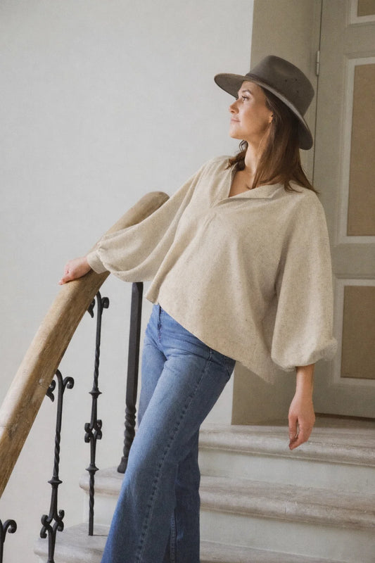 De blouse is zomers en ruim in boho-stijl met grote mouwen, gemaakt van een linnen en viscose mix.
