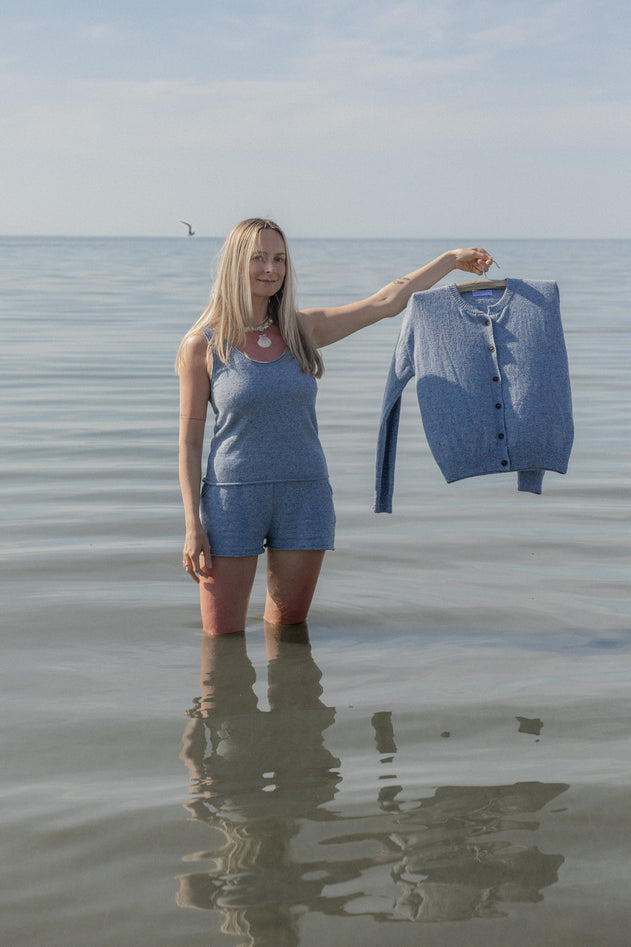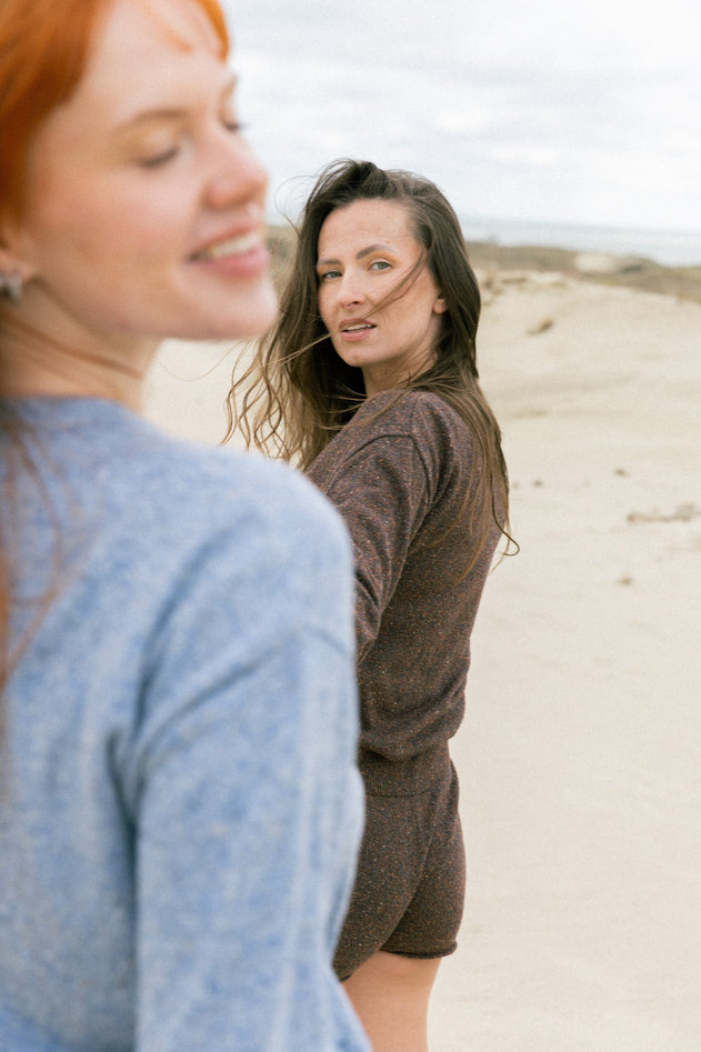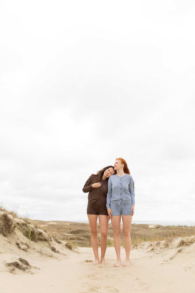 De Sabbia-set is gebreid van een luxueuze mix van organisch katoen, zijde, Merino wol en viscose, wat een unieke zandtextuur creëert. Het minimalistische ontwerp maakt het gemakkelijk om elke stuk afzonderlijk te stijlen en te combineren of als bijpassende set te dragen.