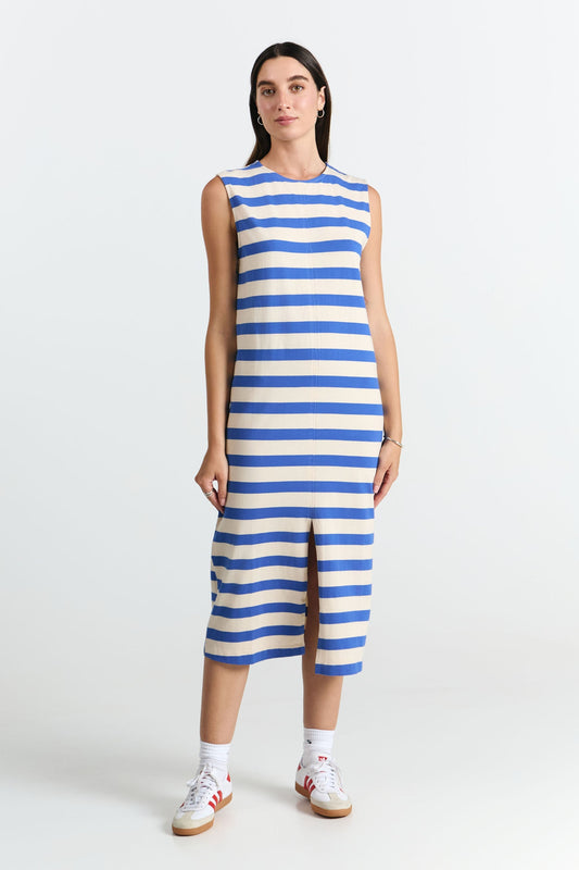 Moeiteloze stijl ontmoet comfort in deze blauw-wit gestreepte mouwloze midi-jurk. De klassieke ronde hals en minimalistische silhouet creëren een strakke, moderne look die zowel flatterend als veelzijdig is. Gemaakt van zachte organisch katoen.