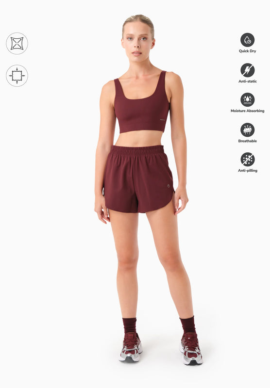 De Selenna Shorts in Bordeauxrood combineren duurzame prestaties met alledaagse veelzijdigheid. Deze regular-fit shorts zijn gemaakt van 56% gerecycled polyamide en 44% elastaan en hebben een ademende, sneldrogende stof met responsieve stretch. Een geïntegreerde mesh slip biedt medium ondersteuning, terwijl de elastische tailleband zorgt voor een goede pasvorm. De antistatische behandeling en de zachte peach-touch afwerking verhogen het comfort bij yoga, training en vrijetijdskleding.