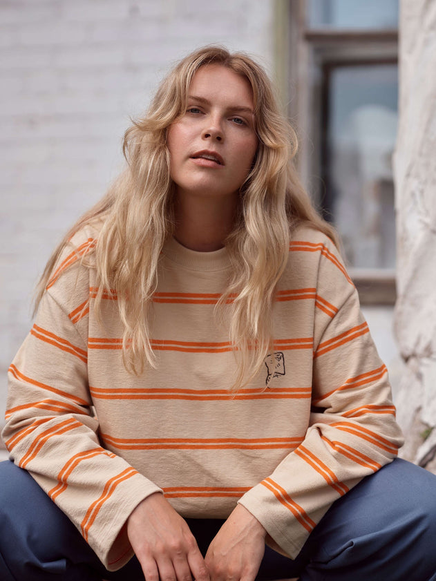 Dit gestreepte oversized jacquard shirt heeft een opvallende wervelende borduursel op de borst, wat vakmanschap van hoge kwaliteit laat zien. Gemaakt met lange mouwen voor extra veelzijdigheid, is het een GOTS-gecertificeerd product, dat organisch en duurzame kwaliteit garandeert. De jacquard breisel biedt textuur en duurzaamheid en zorgt tegelijkertijd voor een comfortabele en ontspannen pasvorm. Perfect voor degenen die zowel stijl als verantwoorde productie waarderen.
