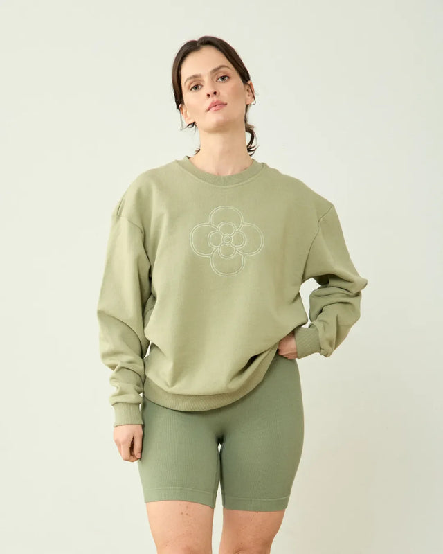 Soft organic cotton sweatshirt in apple green with embroidered flower detail. Made in Portugal from 100% organic cotton. Versatile layering piece—wear solo for casual comfort or pair with leggings and shorts for an coordinated athletic look.