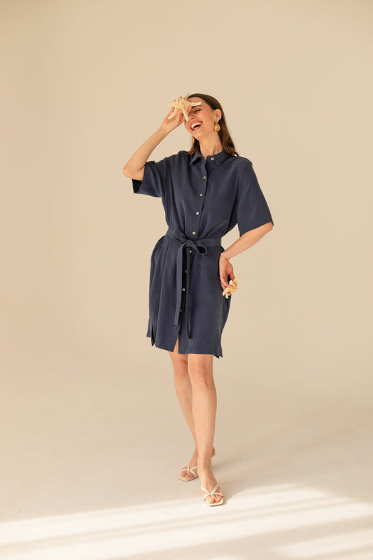 De Soleil cupro marineblauwe jurk is perfect voor warme dagen en vakantiereizen. De jurk heeft een los overhemdmodel met korte mouwen. Hij sluit met parelknopen en heeft een extra strikceintuur. Kleine splitjes aan de zijkanten geven het silhouet een luchtigheid.
