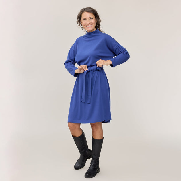 De luxe merino jurk heeft een recht gesneden ontwerp, maar de vorm kan worden aangepast met een aparte riem. Een naadloze opstaande kraag, naar binnen gevouwen, siert elegant de halslijn terwijl een verlaagde schouder een vleugje zachte aantrekkingskracht aan de jurk toevoegt. Houd er rekening mee dat er, in tegenstelling tot op de foto, een naad aan de zijkant van de riem is.