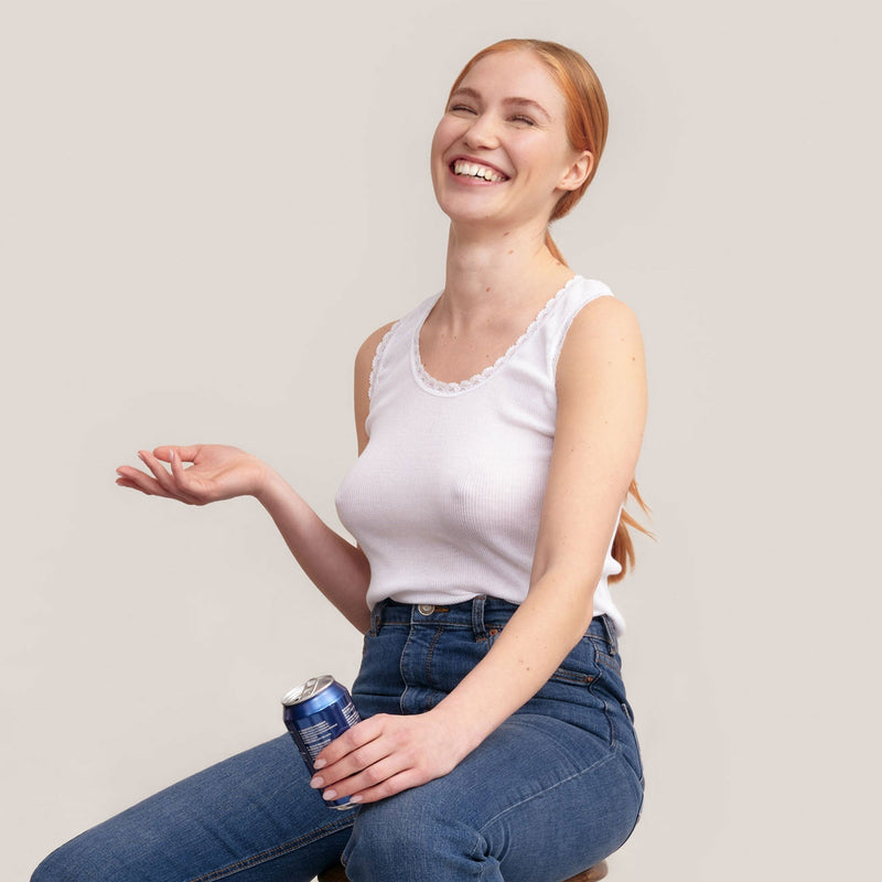 Het mouwloze shirt is een dun, rekbaar topje gemaakt van katoenjerseystof. Het heeft een mooie smalle kanten afwerking bij de halslijn en armsgaten.