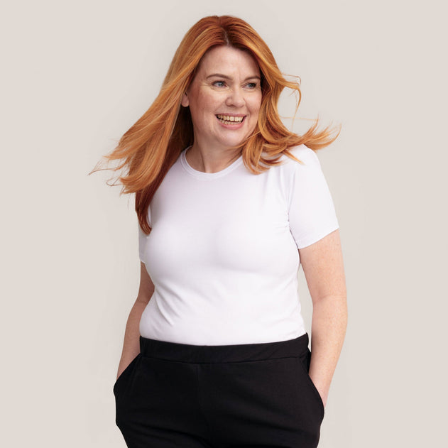 Het Slim T-shirt is de perfecte combinatie van comfort en stijl. Het heeft een getailleerde snit die een verbluffend silhouet op het lichaam creëert. De mouw van het T-shirt is aansluitend, zodat je het onder strakkere kleding kan dragen. De lengte van het T-shirt valt op de heupen en is korter dan een traditioneel T-shirt. je hoeft zich geen zorgen te maken over de ondoorzichtigheid van het shirt, bh's of tops zullen er niet doorheen schijnen.