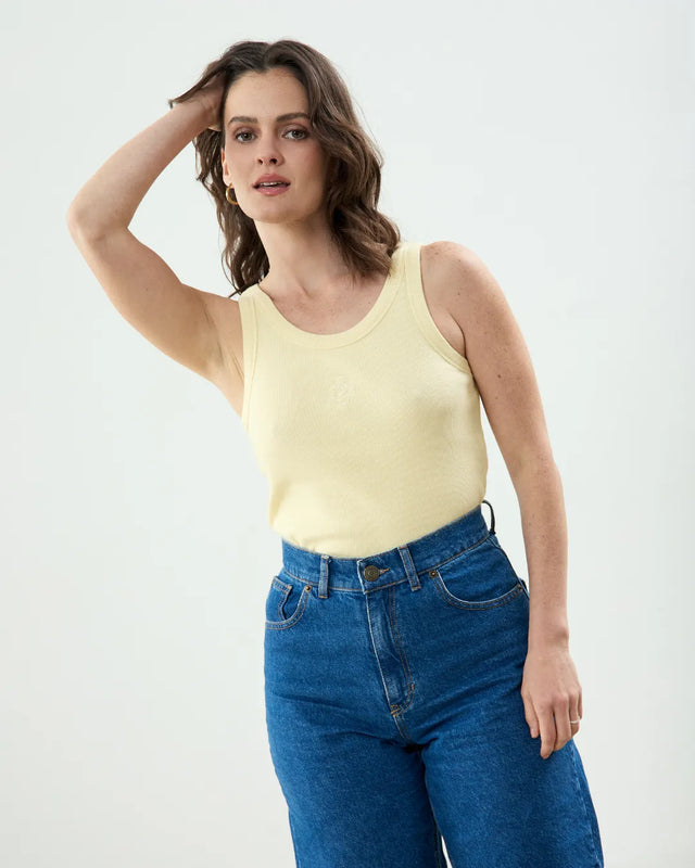 Vanilla Tank Top Een getailleerde katoenen organisch tank top in zacht vanillegeel met een ronde hals en ademende geribde stof, perfect voor de zomer. Met delicaat bloemenborduursel en gemaakt van 95% organisch katoen en 5% gerecycled elastaan, verantwoord geproduceerd in Porto. Draag hem solo met jeans of in laagjes met het gele Yara-shirt voor een veelzijdige, onmisbare capsule wardrobe.