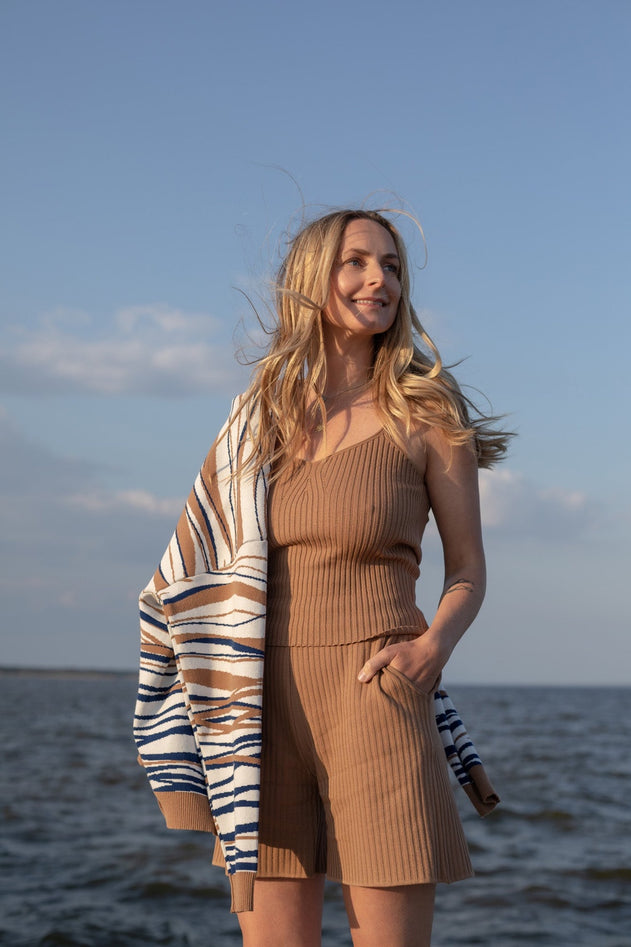 Karamelbruine geribbelde gebreide shorts met zakken en ontspannen rechte pijpen.