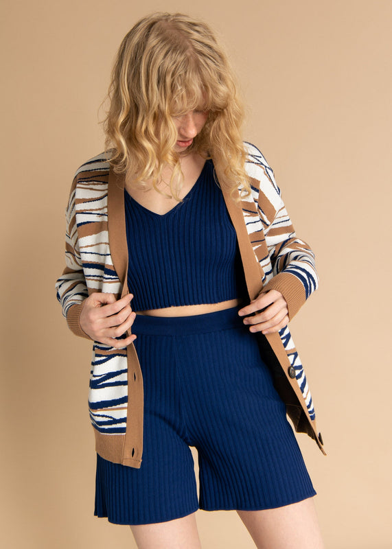 White ribbed knit shorts with pockets and relaxed straight legs.