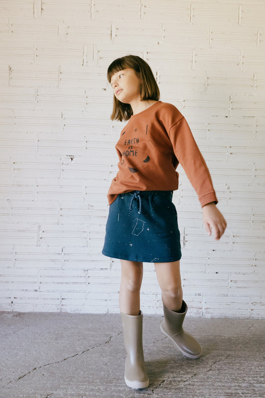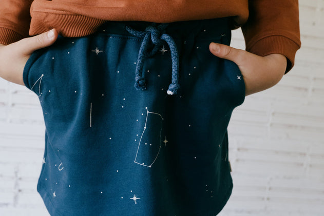 Blauwe kindergaya-rok met Tiralahilacha's middernachtblauwe sterrenbeeldprint. Gemaakt van GOTS organisch katoen.