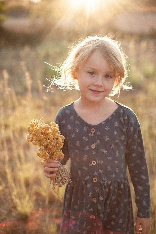 Kinders Sabrina jurk met lange mouwen met verlaagde schouders en een spleet volledig bedekt door knopen. Blauwe kleur met varenbladeren print.