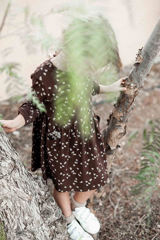 Losvallende jurk met opgestikte zakken. De mouwen hebben een strip die aan een knoop wordt bevestigd en waarmee je ze kan oprollen. Bruine kleur met eikelprint.