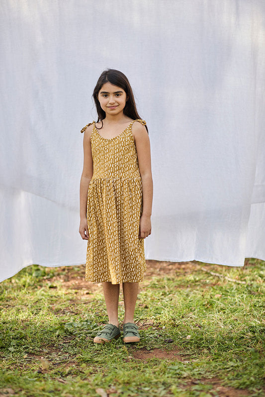Kinderen's Jurk met bandjes met verstelbare strikjes en geplooide taille. Tiralahilacha's etnische print in mosterd.