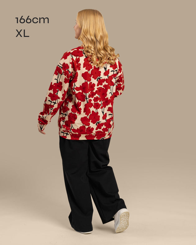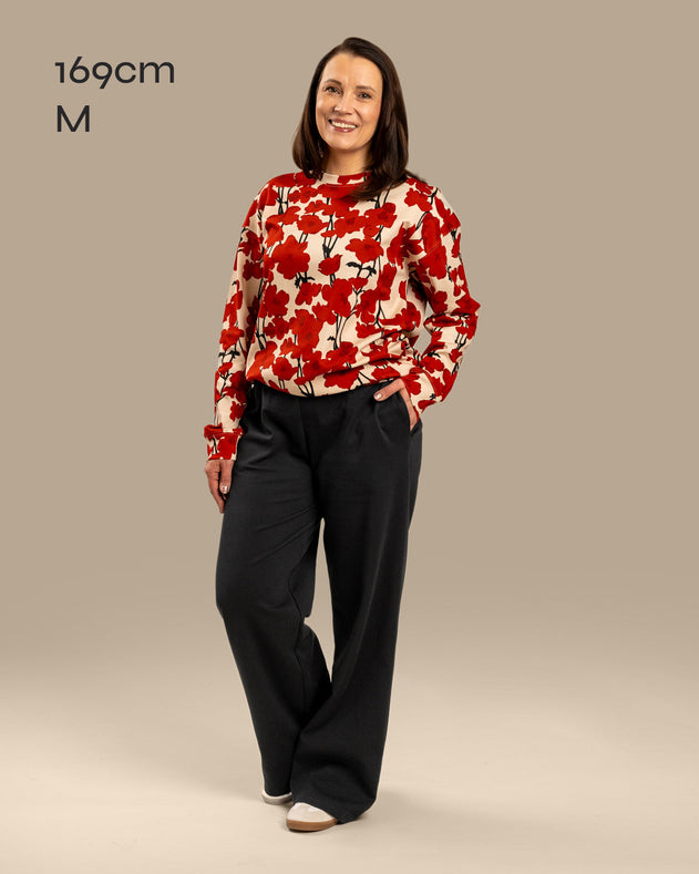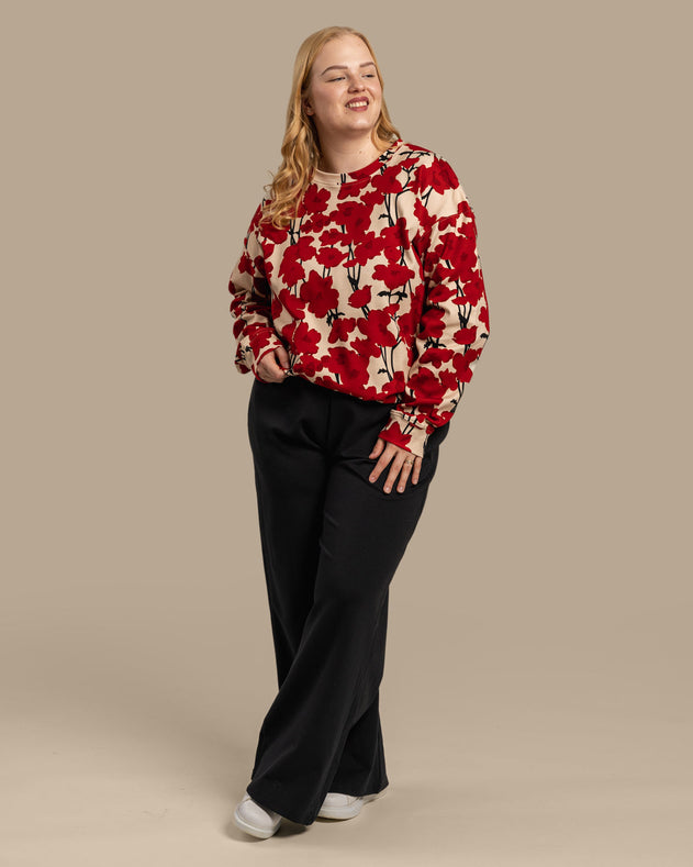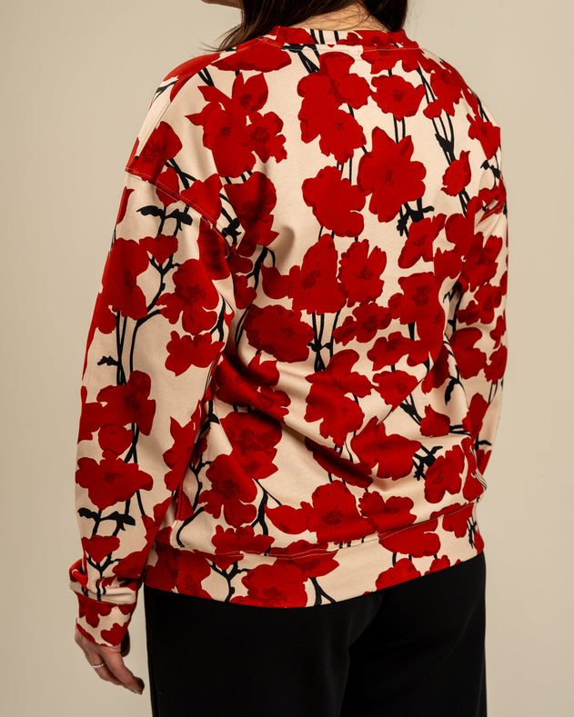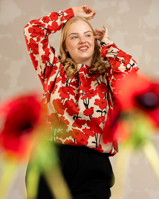 Een casual sweatshirt met een tijdloze, klassieke pasvorm. De lichtbeige basis is prachtig versierd met het opvallende Valmut-patroon, met levendige rode klaprozen. Perfect voor zowel relaxte dagen als een stijlvolle werklook.