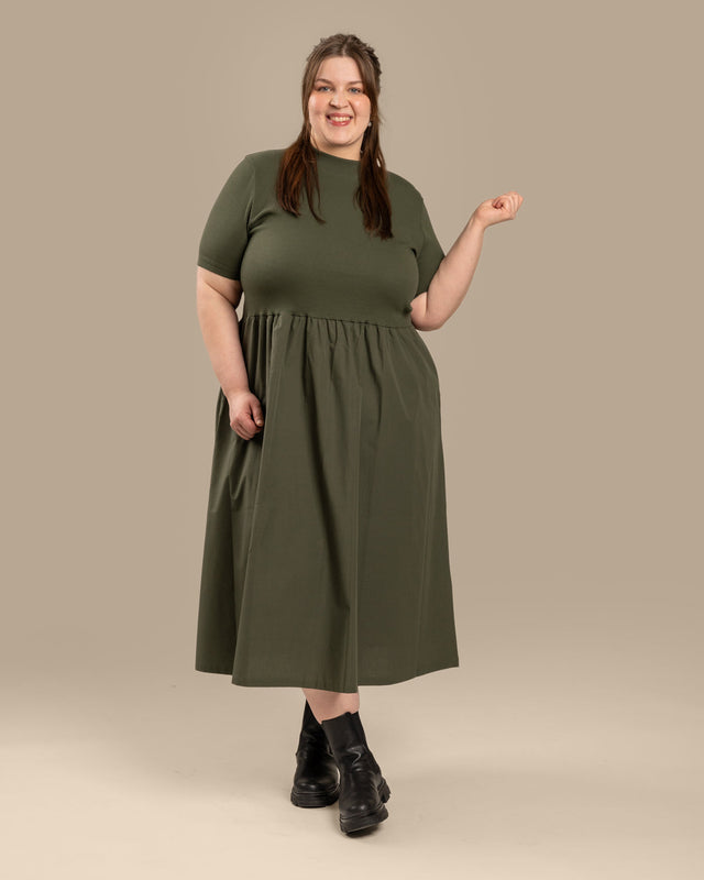 Een flatterende jurk die t-shirt mouwen combineert met een stijlvolle coltrui. De aansluitende top is gemaakt van rekbare ribbrei, terwijl de uitlopende rok is gemaakt van gladde katoenen stof. Afgewerkt met praktische zijzakken, is het de perfecte mix van comfort en elegantie.