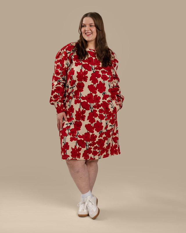 Een charmante jurk met lange mouwen, elegante geplooide mouwen en een klassieke pasvorm. Het heeft een rechte zoom en praktische zijnaadzakken. Versierd met het prachtige Valmut-patroon, is het zowel stijlvol als functioneel.