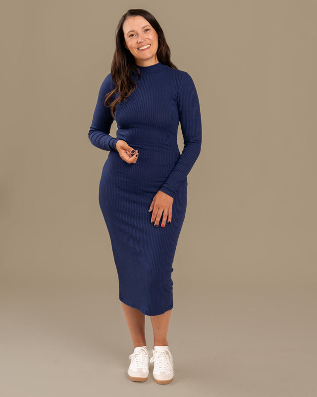 Deze nauwsluitende geribde jurk is gemaakt van flexibel breisel, wat zorgt voor comfort en een flatterend silhouet. Met een verfijnde coltrui en lange mouwen biedt het een gepolijste uitstraling die geschikt is voor verschillende gelegenheden. De elegante diepblauwe tint voegt tijdloze stijl toe. Voor iemand die 170 cm lang is, valt de jurk net onder de knie.