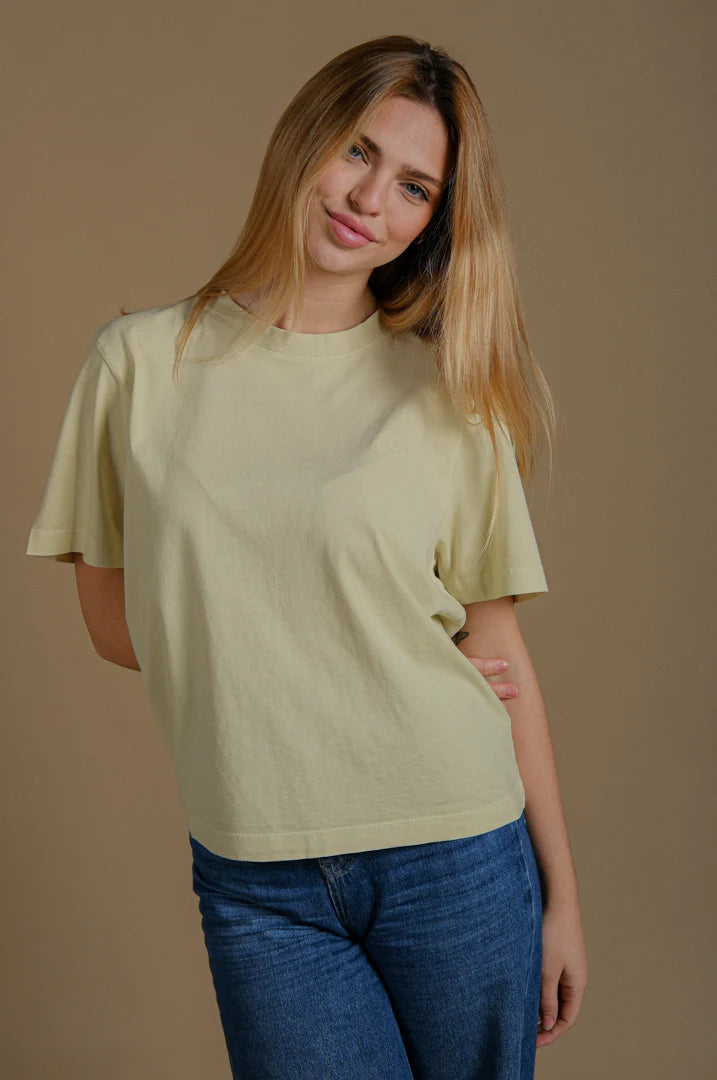 Damesbijgesneden organisch katoenen T-shirt. Gepigmenteerd geverfd voor een mooie, aardse tint.