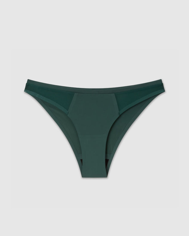 De Micro Period Bikini Briefs van UNDERSTATEMENT in Pine Green zijn een klein pakket vol praktische voordelen. Met een gemiddelde absorptie kunnen deze slips tot vier tampons aan menstruatievloeistof bevatten. Het menstruatieondergoed is in laboratoria getest en kan in de machine gewassen worden op 30°C/86°F. Ze geven prioriteit aan comfort zonder in te boeten op stijl.