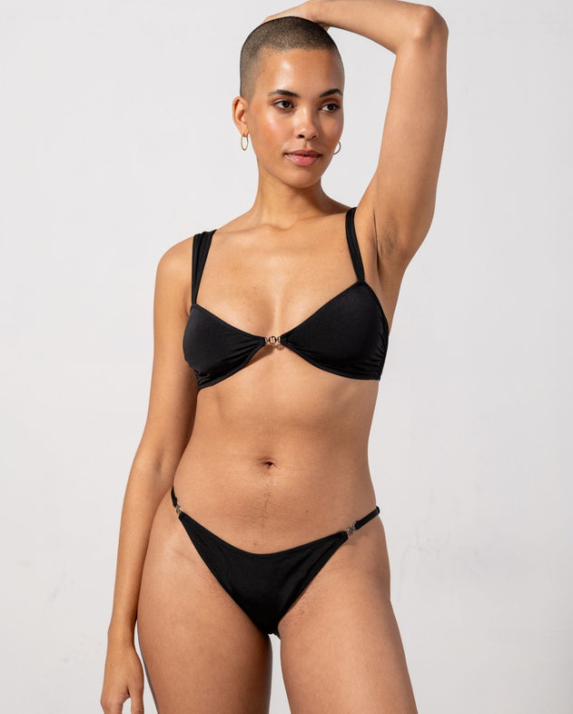 Fel, flatterend en klaar voor het strand. Hoogglans badmode stof met een gladde aanraking. Gemaakt met ECONYL®: een geregenereerd polyamidegaren gemaakt van afgedankte visnetten en ander afvalmateriaal. Laag uitgesneden bikinislip met een flatterende gescooped taille en gedurfde bedekking. Dunne zijbandjes met metalen merkafwerking voor een comfortabele, verstelbare pasvorm.