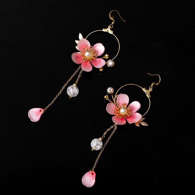 In het oog springende oorbellen met prachtige roze bloemen. De zachte roze kersenbloesems en maanaccenten vertegenwoordigen vernieuwing, kracht en vrouwelijke energie.