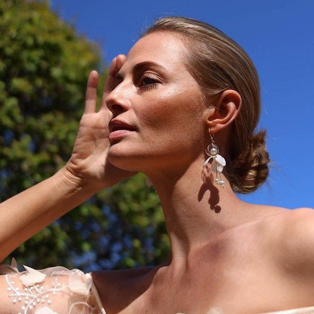 De oorbellen hebben witte bloemblaadjes gemaakt van milieuvriendelijke materialen die aan een duurzame metalen oorhaak hangen, elk paar is duurzaam en zacht voor de aarde. Voor een casual dag of avondje uit of als finishing touch voor jouw nachtelijke looks met de verfijnde en subtiele toevoeging van deze oorbellen.