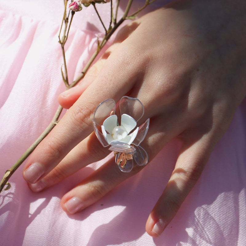 Prachtige bloemenring met verfijnde stijl. Aan goud afgewerkte Franse haken hangen prachtige heldere bloemen die een glanzende witte kraal met een afgeronde goudafwerking dragen. Precies de ring je nodig heeft wanneer je veel wil zeggen, zonder te veel te zeggen!