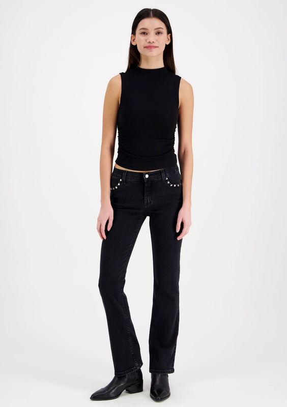 Emily Straight Fit High Waist Jeans hebben een klassieke rechte pijp silhouette dat een tijdloze en flatteuze pasvorm biedt. Ontworpen met een hoge taille voor verbeterd comfort en ondersteuning, bevatten deze jeans subtiele klinknagelversieringen op de voorzakken, wat een verfijnd detail toevoegt dat de algehele look verheft. Ideaal voor zowel casual als verfijnde outfits, combineren ze stijl en functionaliteit met deskundig vakmanschap.