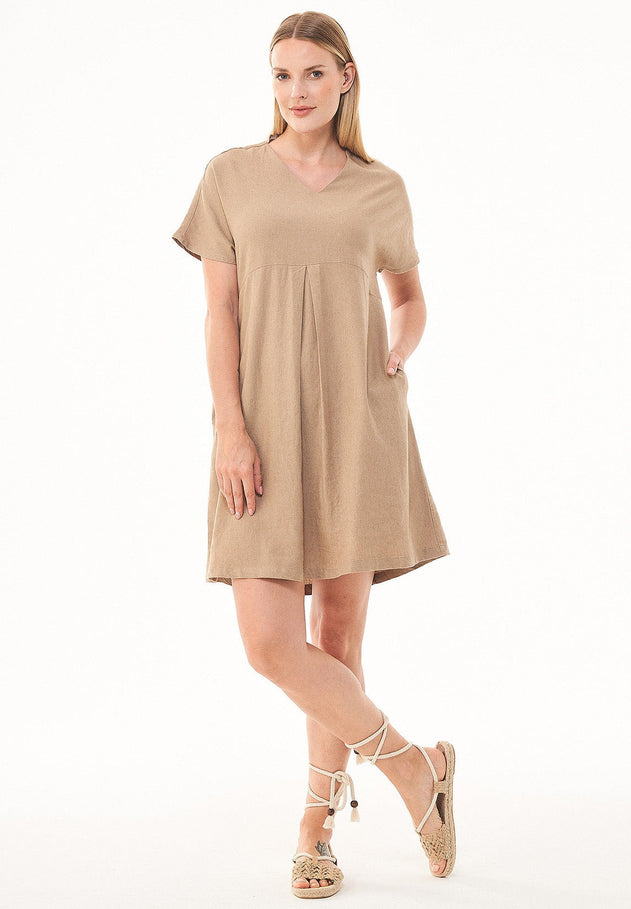Dames's korte mouwloze jurk van viscose en linnenmix met zijzakken en een V-hals.