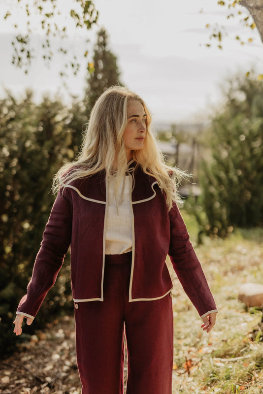 Het Hendaye-jack is gemaakt van 100% Baltisch linnen en combineert ingetogen raffinement met functioneel design. De kenmerkende cape kraag en het strikdetail aan de voorkant doen denken aan vintage gevoeligheden, terwijl het minimalisme behouden blijft. Het natuurlijke ademende vermogen van de stof en de structurele integriteit maken het een ideaal laagjesstuk voor overgangsseizoenen - zowel geschikt voor de ochtendkoelte als voor een gelaagde styling. Deze jas is gemaakt voor een lange levensduur en past zich sierlijk aan alle jaren en gelegenheden aan, en belichaamt de principes van weloverwogen, langzame mode.