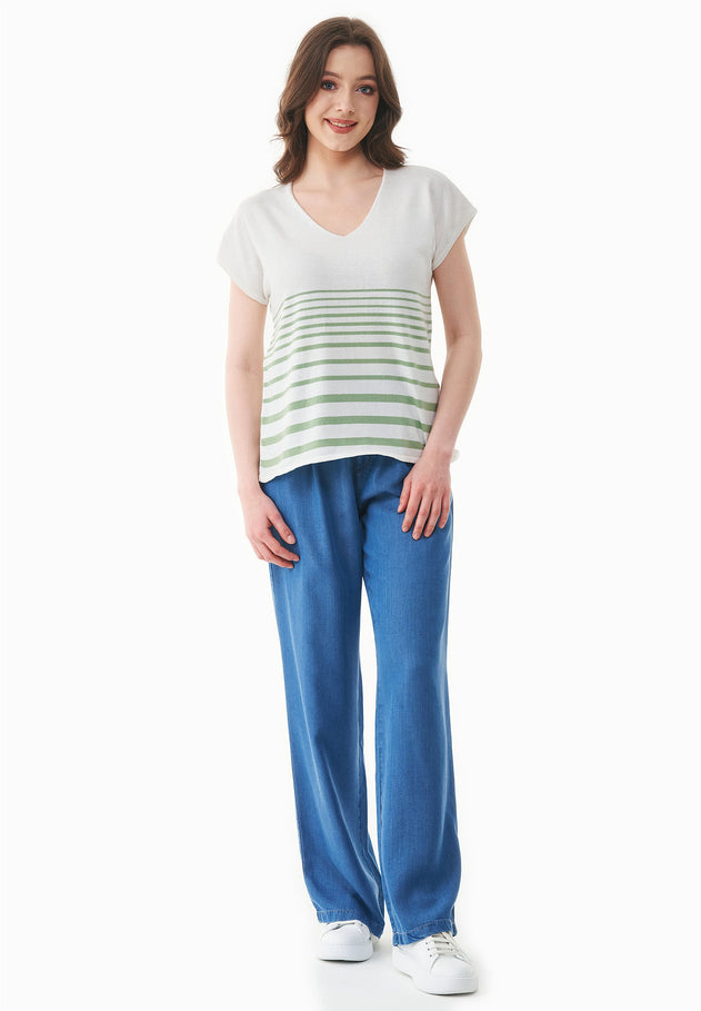 Women's Striped Knit T-Shirt Off White/Matcha Green