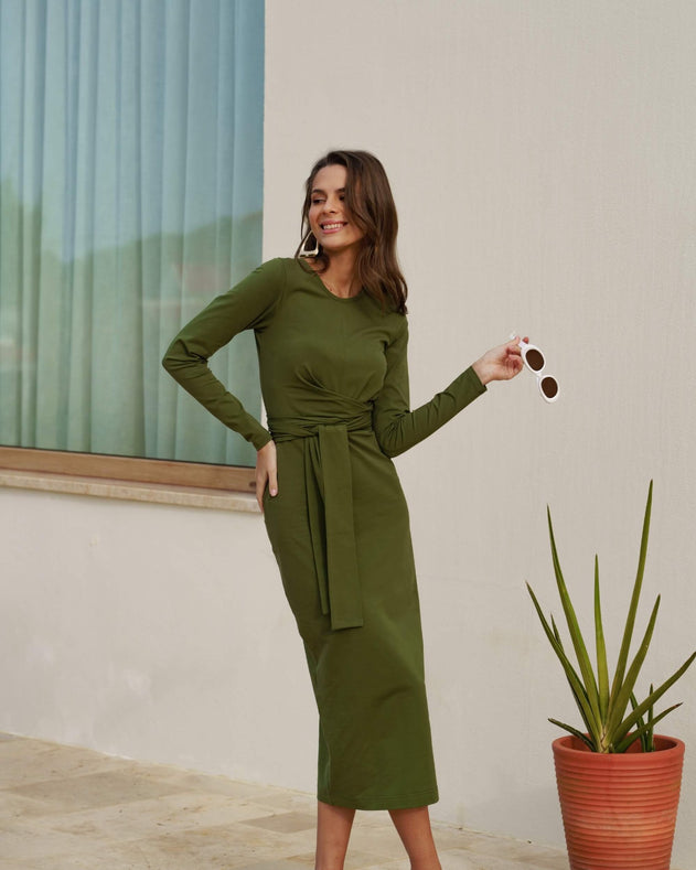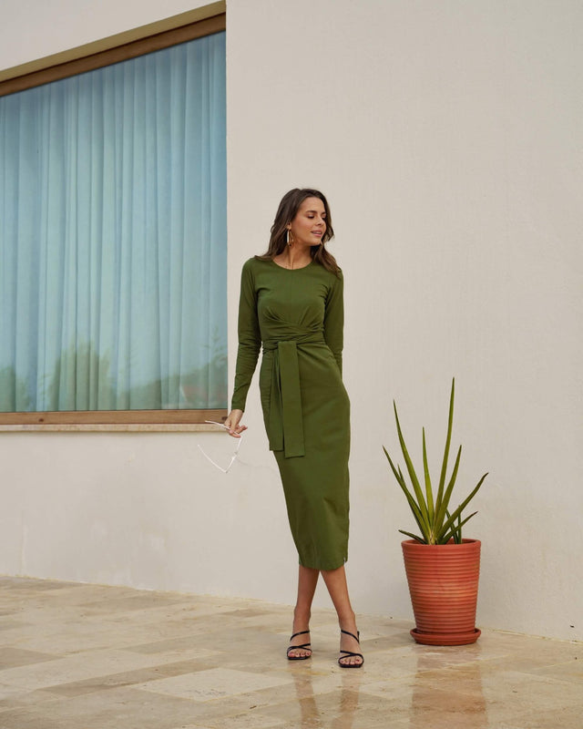 De Zoey-jurk is een veelzijdige must-have jurk voor dagelijks gebruik! De aansluitende snit benadrukt de beste eigenschappen, terwijl de midi-lengte zoom een elegante en veelzijdige uitstraling creëert. Een mooi detail van de jurk is de strikceintuur die een wikkelstijl silhouet creëert. Je kunt de riem naar eigen smaak voor of achter strikken. De prachtige midi-lengte Zoey-jurk is gemaakt van gemerceriseerde, hoogwaardige katoen.